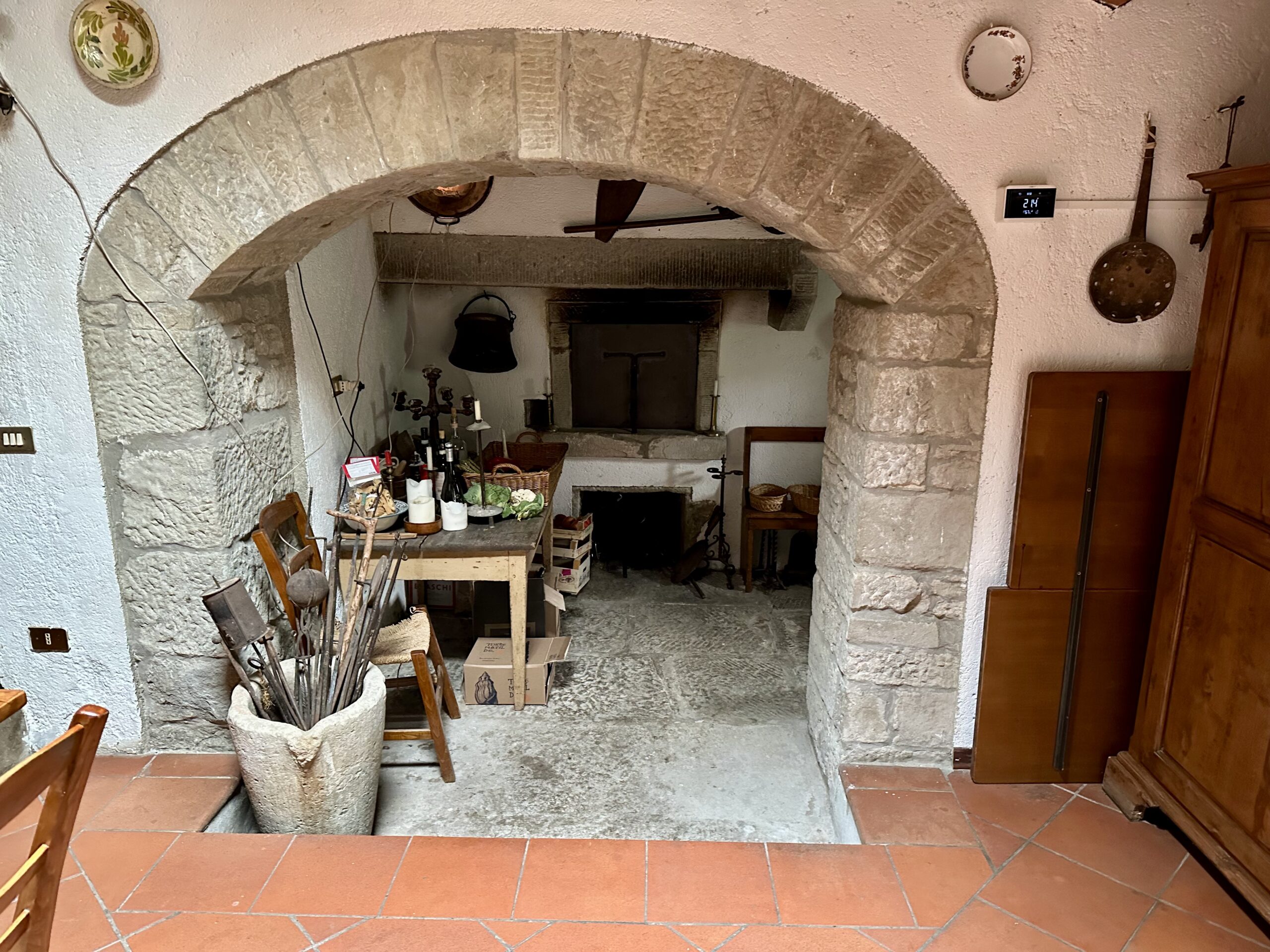The home has four cozy bedrooms, two bathrooms and antiques that tell stories of the past. One of two fireplaces is still used for cooking, keeping alive the tradition of meals made over an open hearth. And in the spacious backyard, the Tiber River flows just beyond the garden of fresh herbs and fruit trees.
